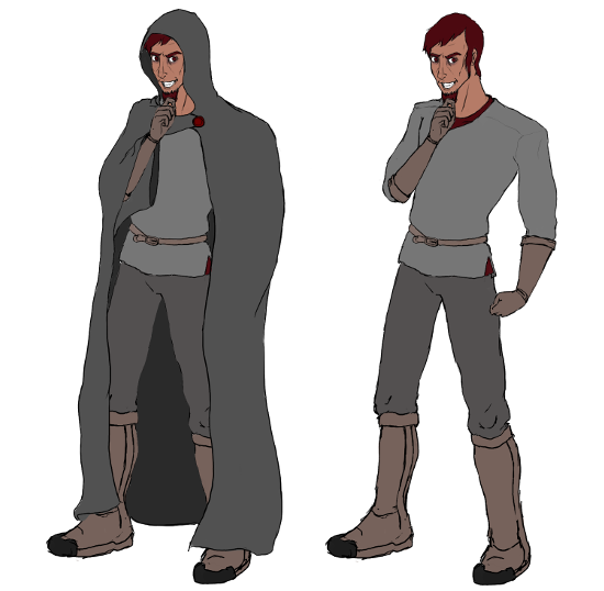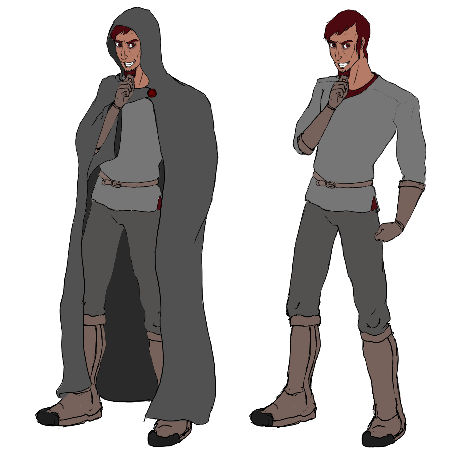 Re in his usual attire, minus his cloak. At least, this is how he usually appears. Can't even tell where he has all his knives hidden.