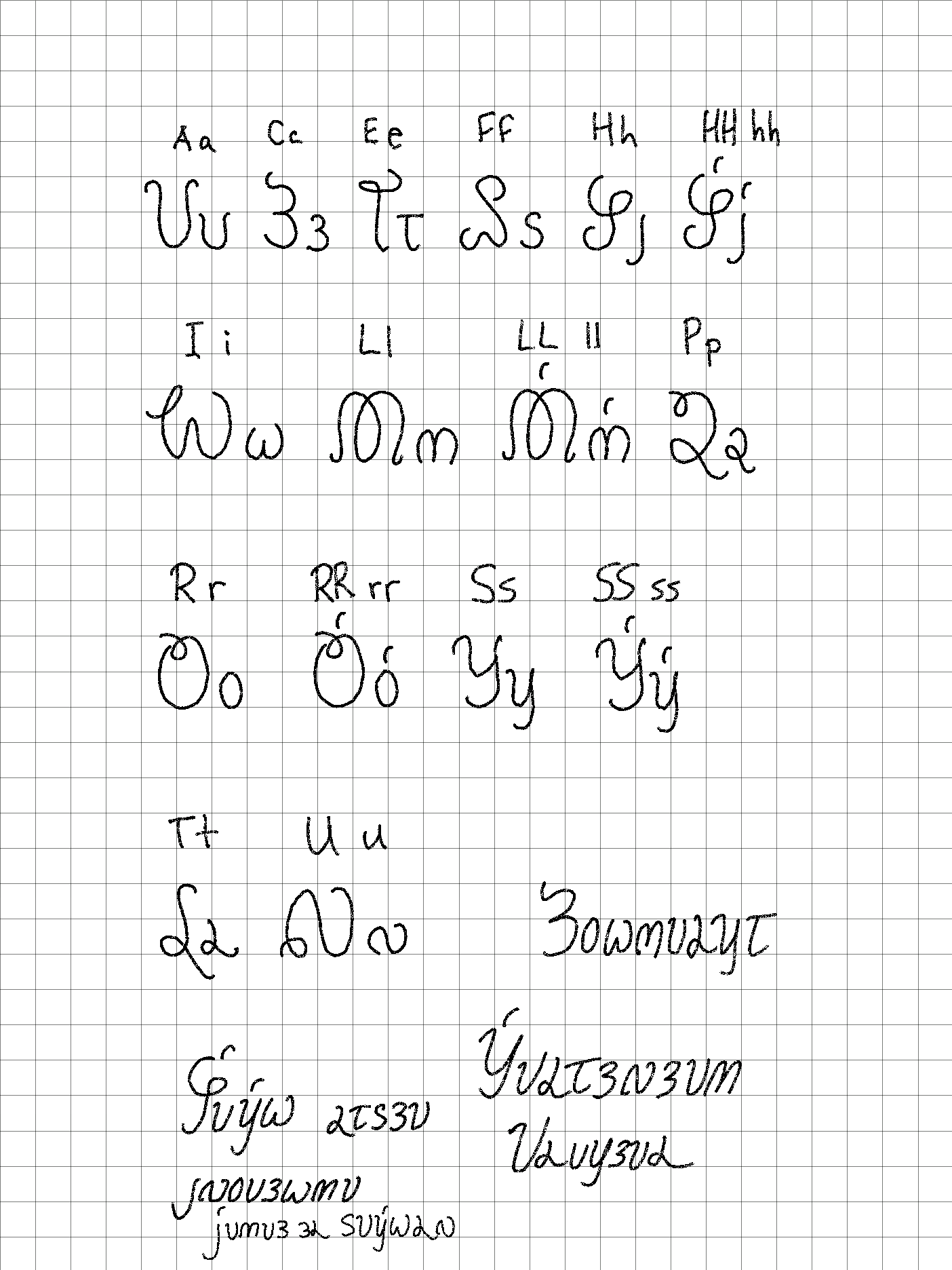 I'm currently working on a font for the Crilatse alphabet. For the moment, below is a chart, showing both uppercase and lowercase letter forms. Uppercase letters are used for the start of lines of text, as well as for the start of proper names.